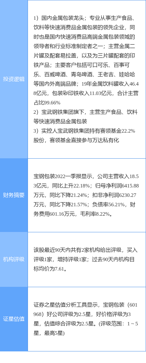 宝钢包装涨停收盘,收盘价6.82元。该股于10点41分涨停,未打开涨停,截止收盘封单资金为2462.97万元,占其流通市值0.4%。