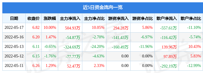资金流向数据方面,5月17日主力资金净流入504.93万元,游资资金净流入294.28万元,散户资金净流出557.61万元。